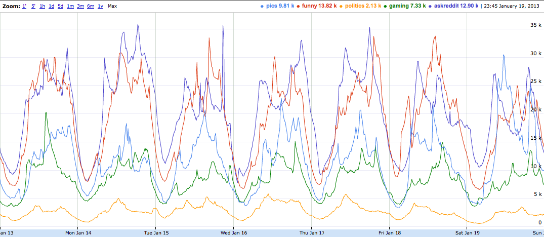 - Run this script periodically for a week to get a .tsv file, load it into Google Spreadsheets, make a chart out of it, and you get this: Media:Reddit-users.png. Now you know exactly when to post your cat photos to maximize the eyeballs on it!